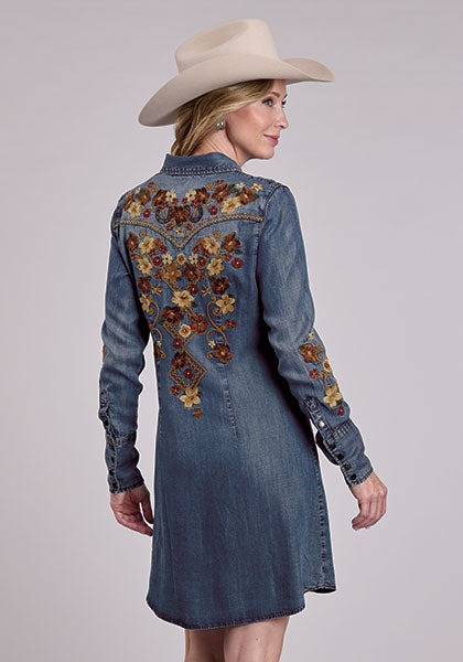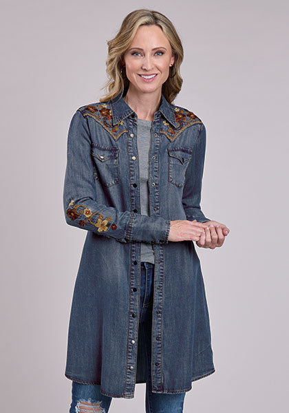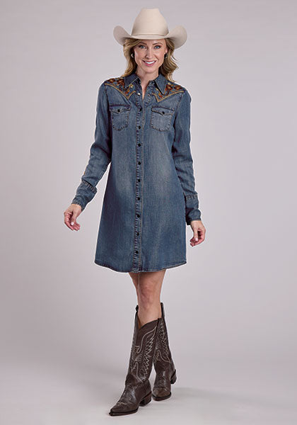 A great denim dress is a wardrobe staple, this one is a standout with gorgeous embroidered details. Soft Lyocell fabric in a mid wash denim is perfect to wear as a dress or a duster. Western deep curve yokes, 5 snap cuffs, and two front snap pockets add up to the ultimate denim statement.
