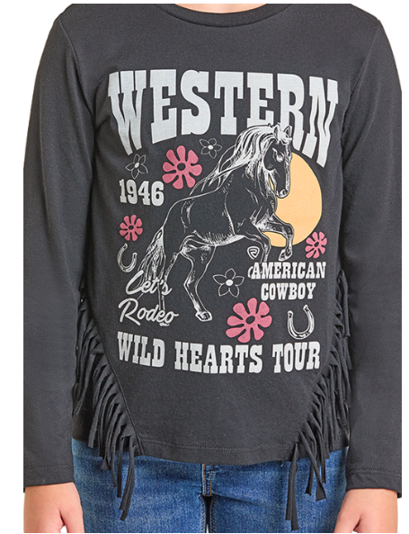 A long sleeve graphic tee with some Western style - cute graphic features a horse with Wild Hearts Tour and fun fringe on the sides!