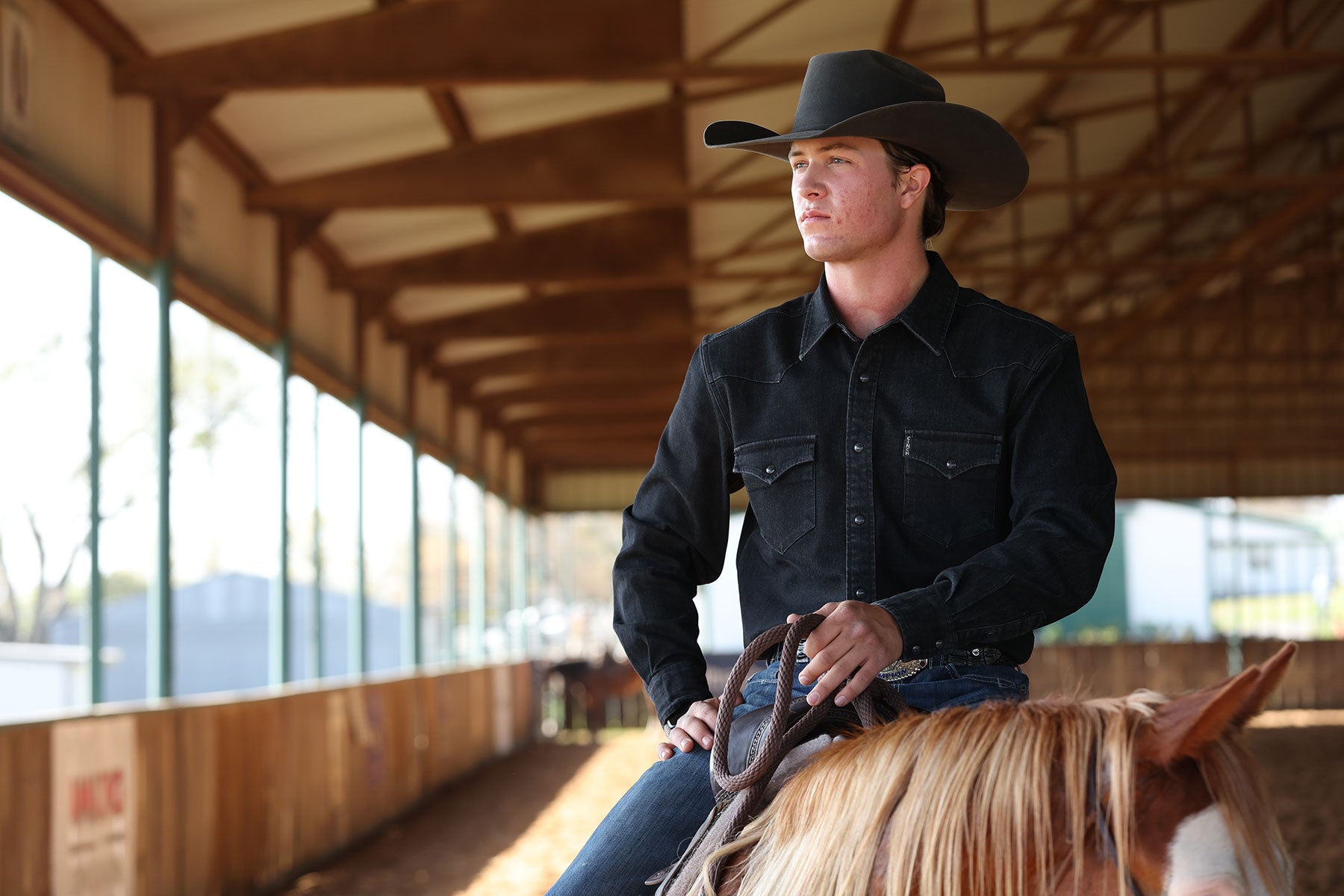 A classic denim shirt in a black wash, traditional pearl snaps and western snap front pockets, western yoke. Stretch fabric for comfort.