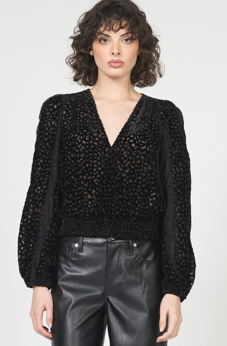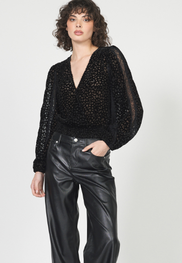 Need to elevate your look? The Amber is the perfect answer - she's gorgeous with rich black burnout velvet fabric - soft and comfy too. Modesty snap on v-neck, long sleeves with elastic at the cuff.