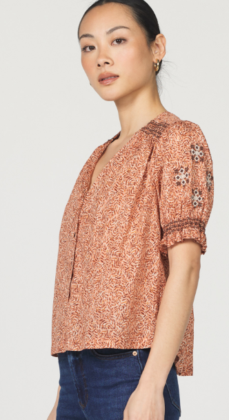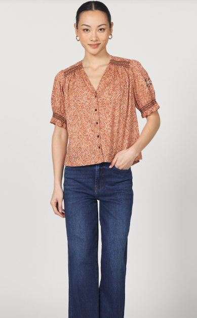 Romantic and elegant, the Ria brings a casual sophistication to your denim look. Super soft 100% cotton, a beautiful Fall color palette highlighted with sweet embroidery on the elbow length, smocked edge poet sleeves. Pair with the chocolate FIONA denim for the perfect look.