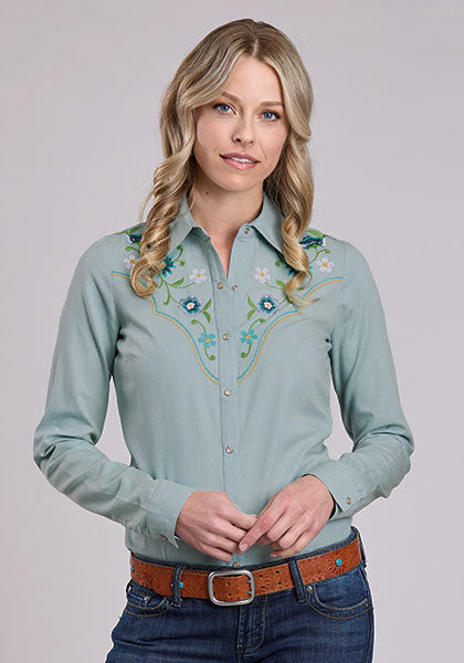 The classic western shirt in soft cotton blue denim with embroidered floral design, snap closure, shirt tail hem.
